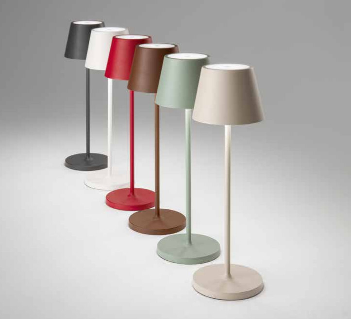 Lampada da tavolo ricaricabile a batterie in alluminio pressofuso verniciato a polvere per uso interno/esterno. Diffusore in acrilico satinato. Testina “touch” che permette l’accensione e la regolazione dell’intensità luminosa.