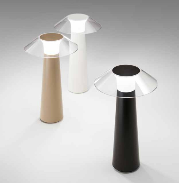 Lampada da tavolo ricaricabile a batterie in metallo e Abs verniciato per uso interno/esterno. Doppio diffusore in acrilico trasparente all’esterno e satinato all’interno. Testina “touch” che permette l’accensione e la regolazione dell’intensità luminosa.