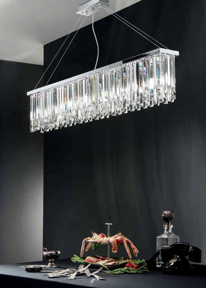 Batida, sospensione con eleganti pendenti in cristallo molato. Struttura in metallo cromato, cavi in acciaio a lunghezza regolabile.