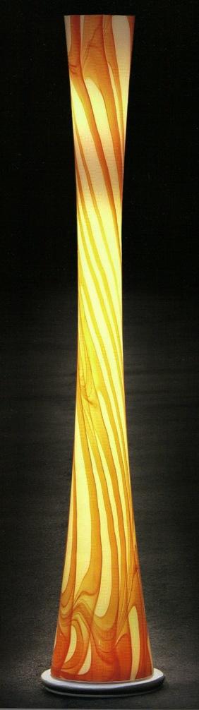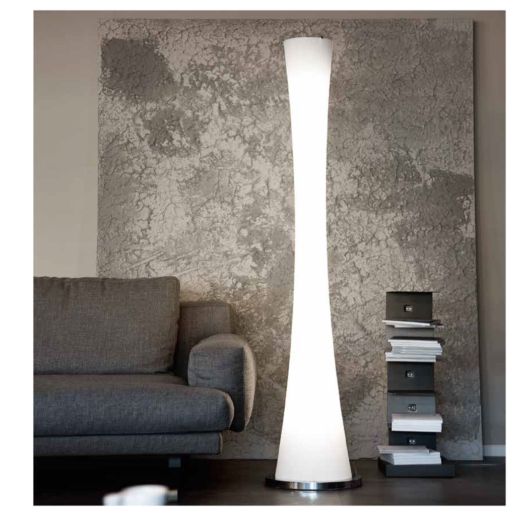 Piantana di grande effetto luminoso e scenografico, vista anche la ragguardevole dimensione del vetro soffiato. Disponibile in varie colorazioni quali ambra-nero, ambra-rosso, multicolore con murrine, nonché bianca. Illuminata da due T5 da 80W, su richiesta è possibile avere il variatore..