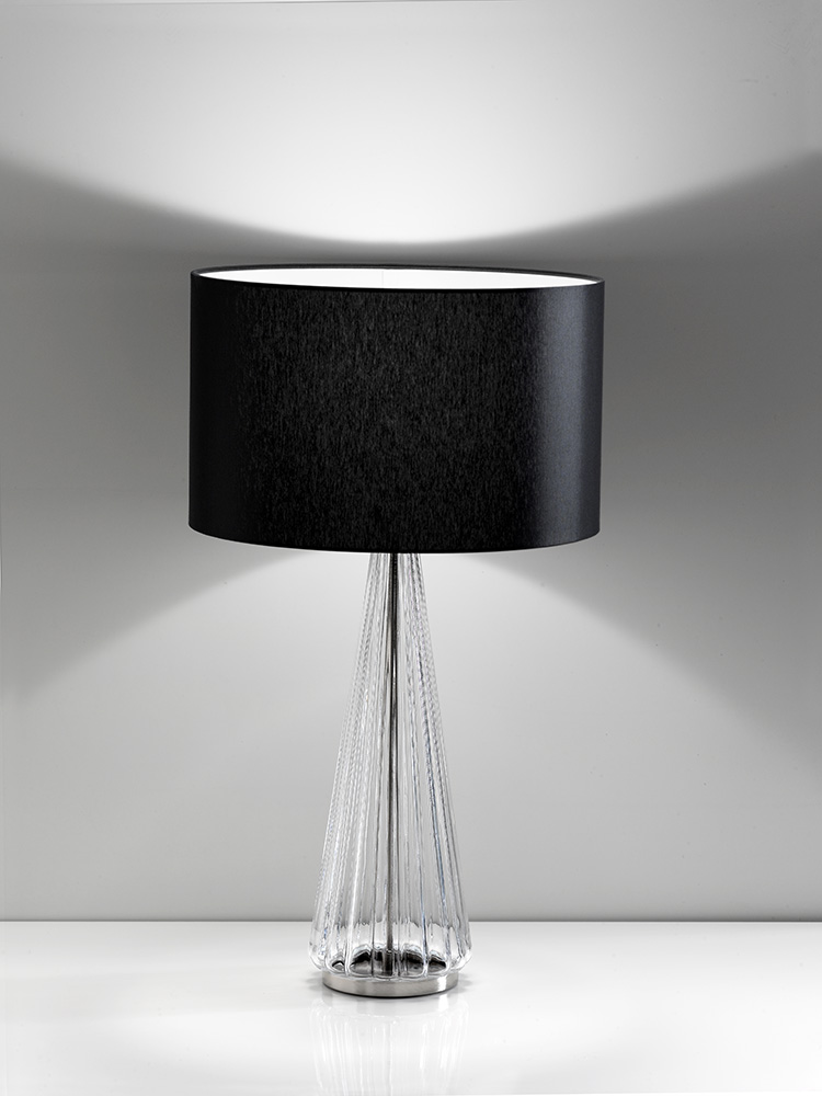 Raffinata collezione in vetro soffiato basata su una forma longinea strutturata da lunghe coste di vetro che fungono da paralume diffusore