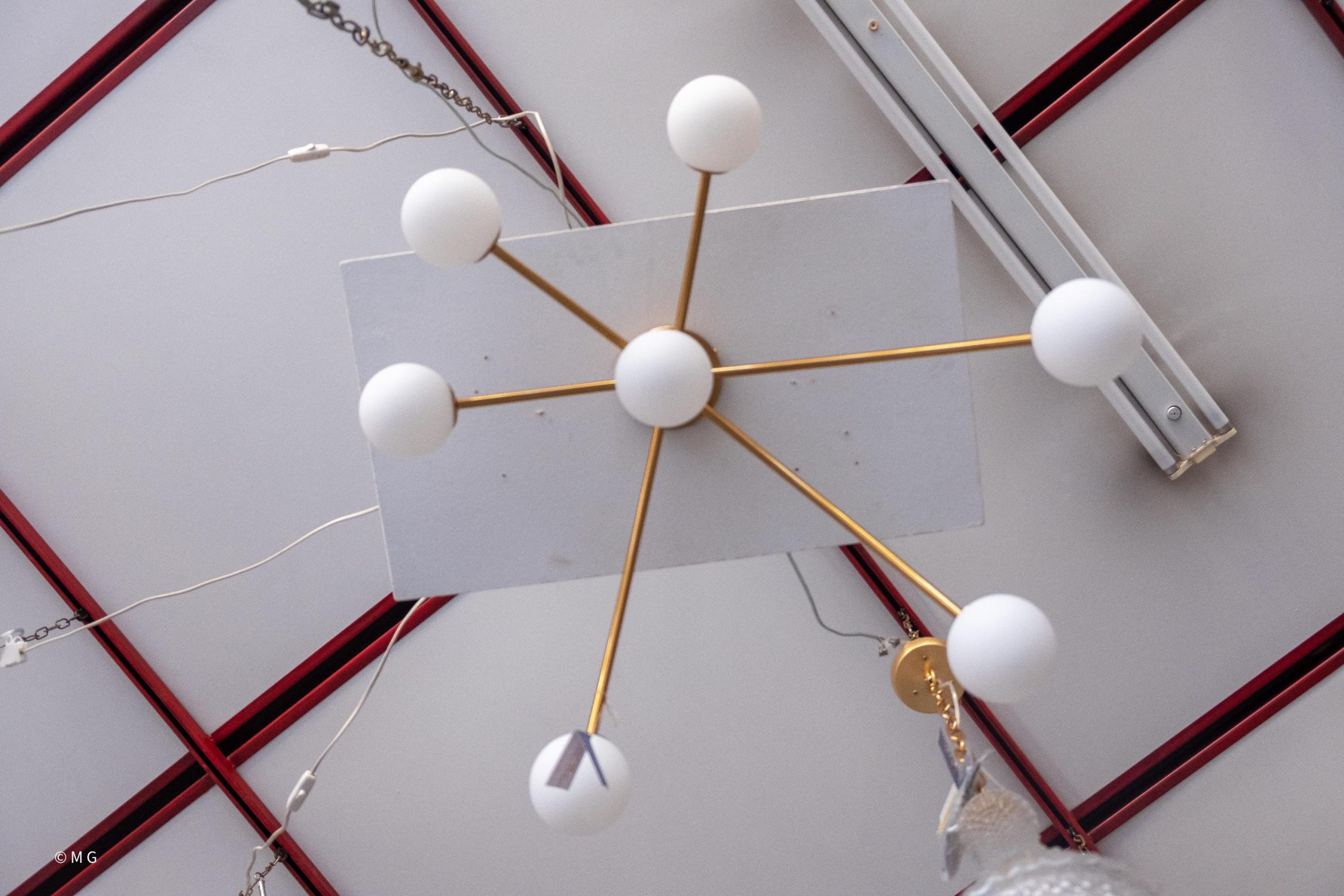 Plafoniere con strutture in metallo verniciato bronzo e diffusori in vetro soffiatto biancolatte.