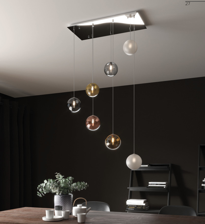 Collezione di lampade a sospensione composta da una o più sfere in vetro pirex soffiato regolabili in altezza e disponibili in diverse finiture.