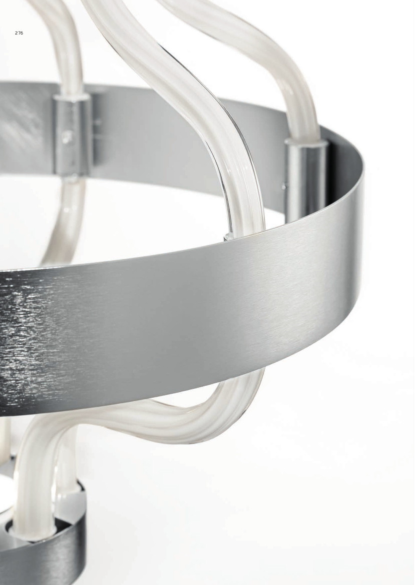 Le memorie di antichi splendori si cristallizzano in tubi di vetro soffiato curvati ad arte e cinti da eleganti fasce di metallo.