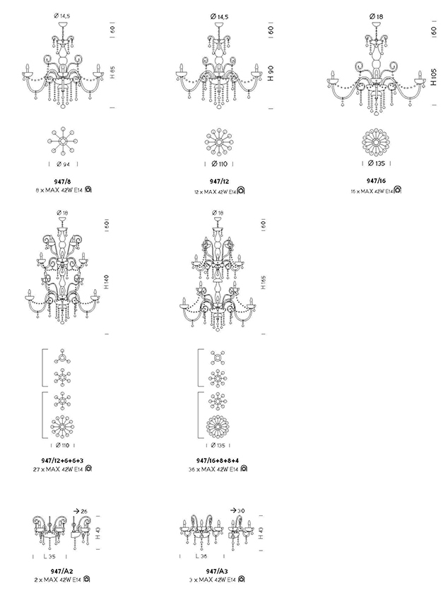 Una pioggia di luce invade l’intero lampadario e si propaga nell’ambiente circostante grazie alla magia dei lustrini. Per mezzo della rifrazione, le facce delle bobeches e dei pendagli in cristallo di alta finitura, creano uno vero e proprio spettro colorato dall’effetto suggestivo e onirico. La lavorazione artigianale del vetro impreziosisce la collezione per mezzo di bracci e pastoriali lavorati a mano secondo la tecnica del torciglione che ricorda l’intreccio di una corda.