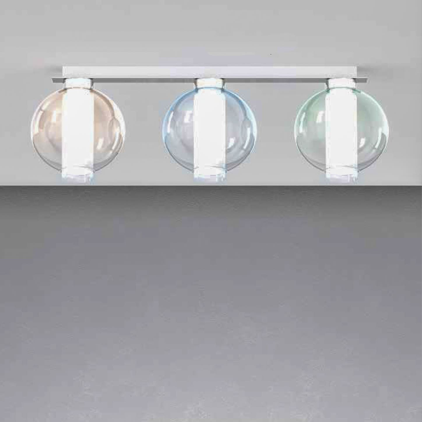 Collezione di lampade a plafoniera composte da “uno” o più diffusori in vetro pirex soffiato sostenuti da strutture metalliche in colore cromo-ottone satinato-bianco opaco