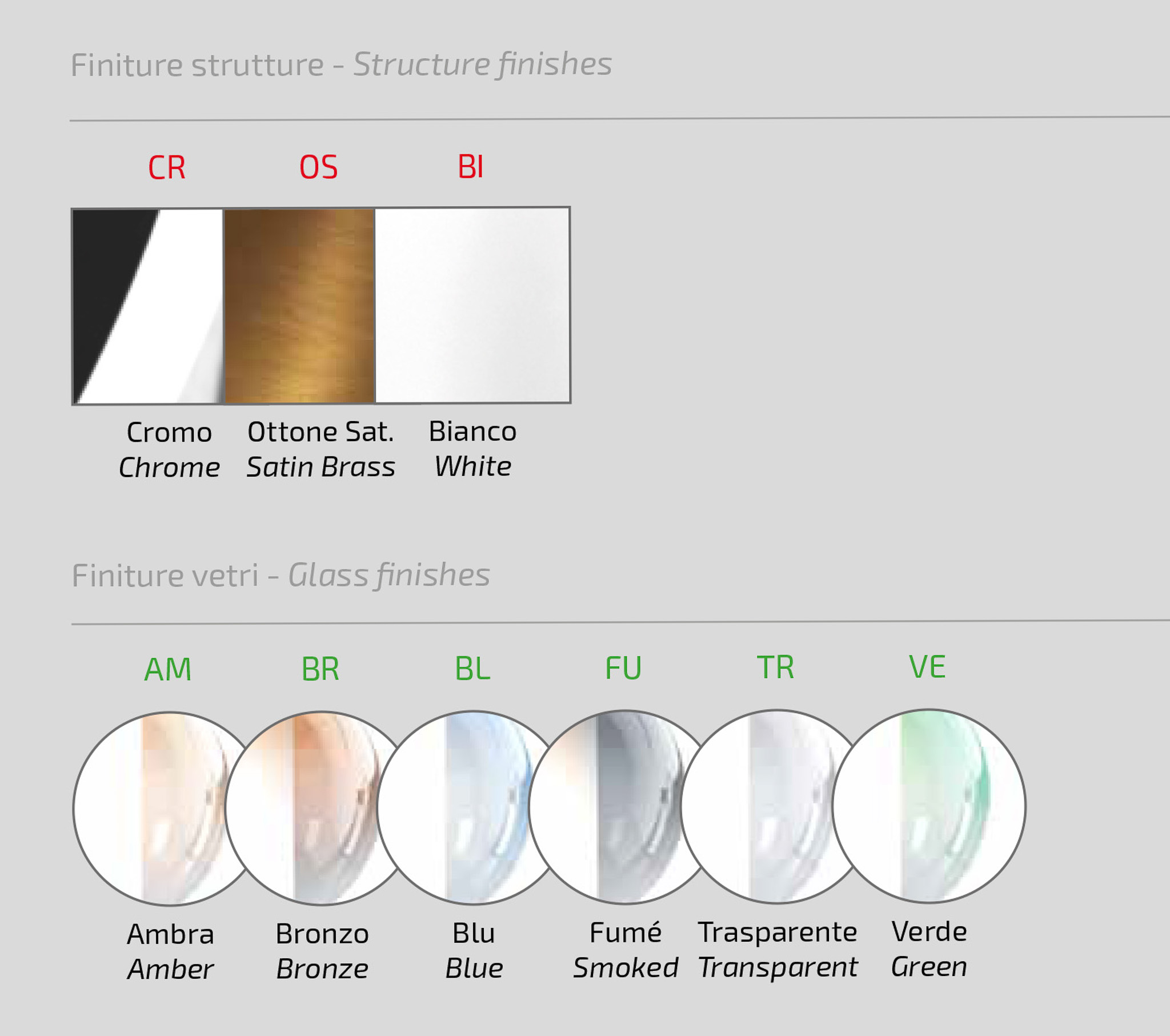 - Montatura in metallo con finitura: Cromo/Ottone Satinato/Bianco opaco