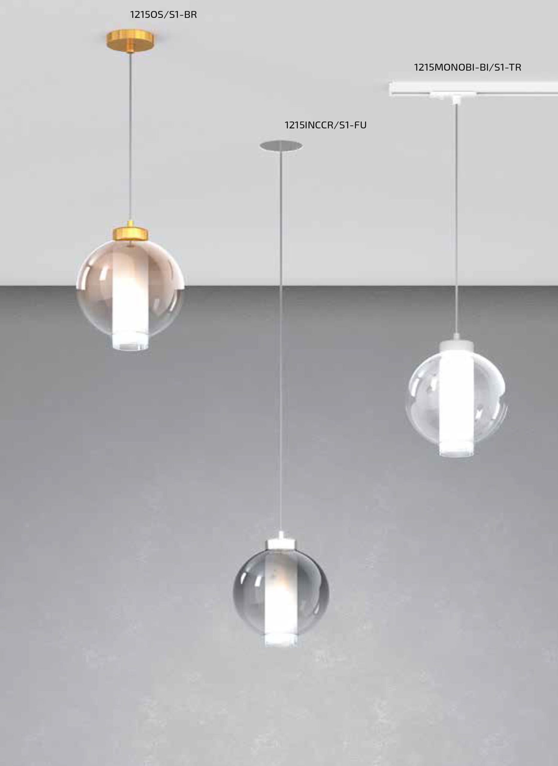 Collezione di lampade a sospensione composte da “uno” o più diffusori in vetro pirex soffiato sostenuti da strutture metalliche in colore cromo-ottone satinato-bianco opaco