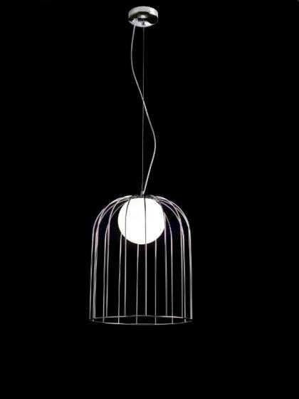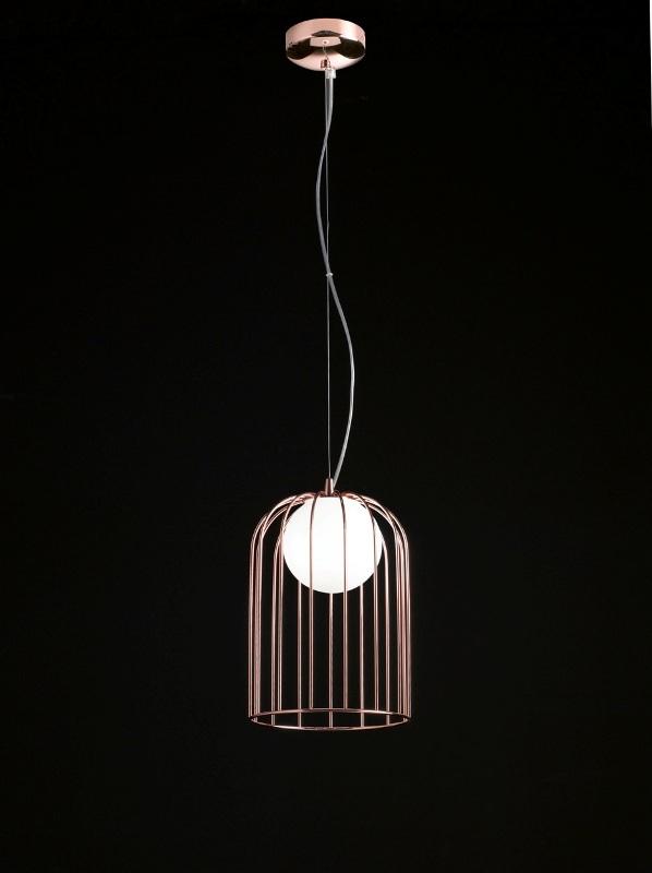 Collezione di tre sospensioni e tre lampade d’appoggio composte da una gabbia metallica ed una sfera di vetro soffiato bianco latte. Le finiture disponibili sono cromo o rame lucido