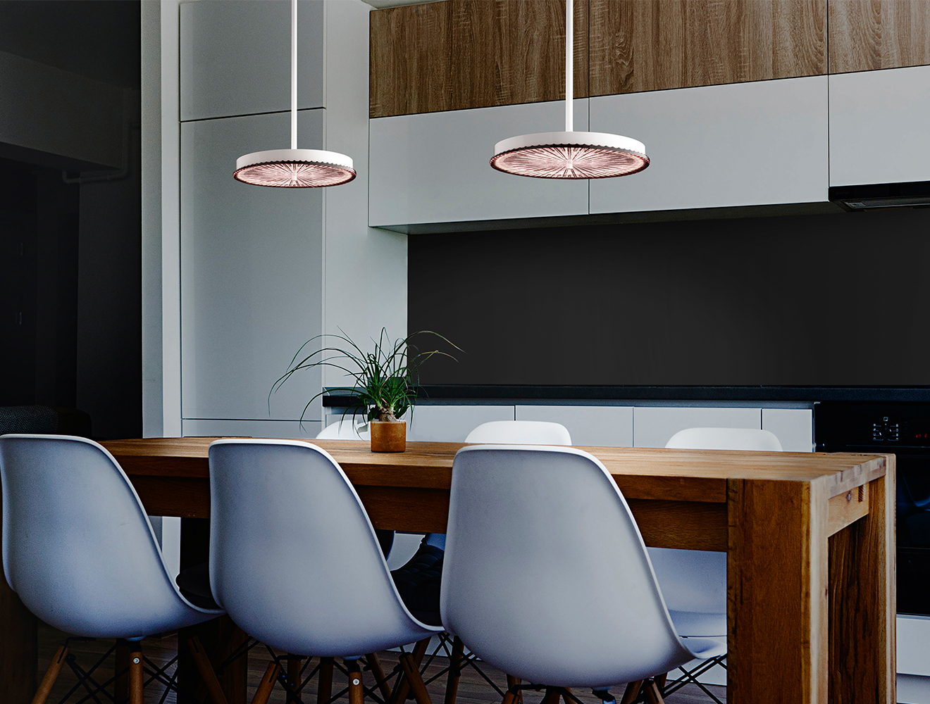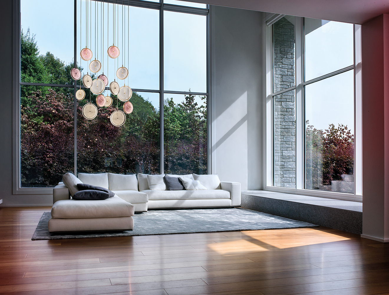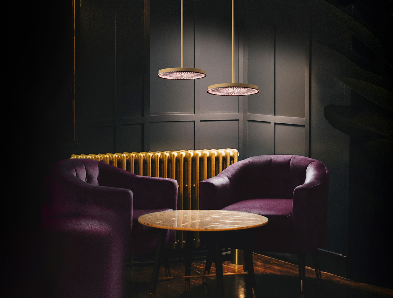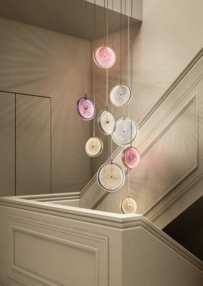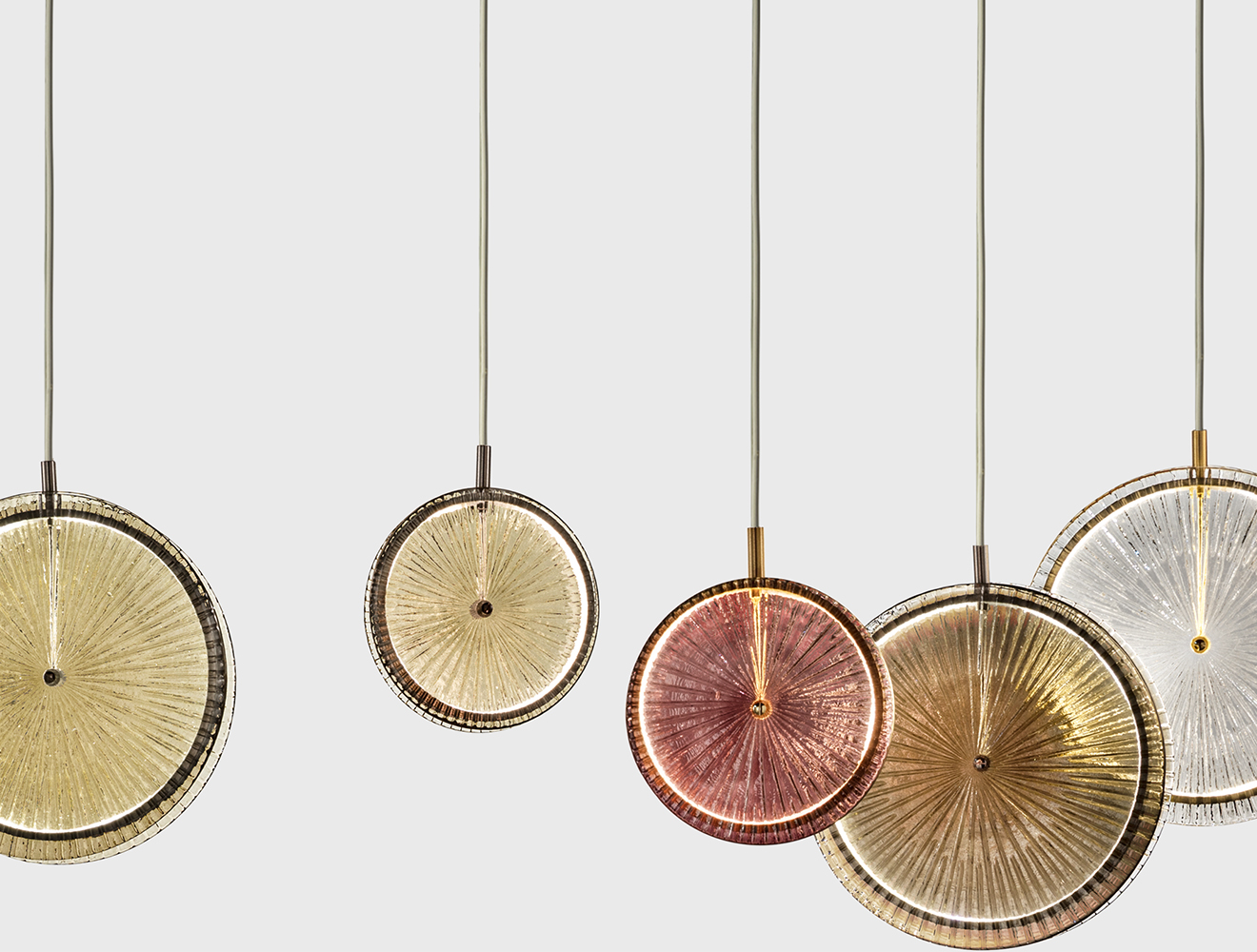 La collezione Lulù con la sua semplice forma ad anello, diventa l’elemento decorativo che illumina, dalla periferia al centro, il vetro che contiene.