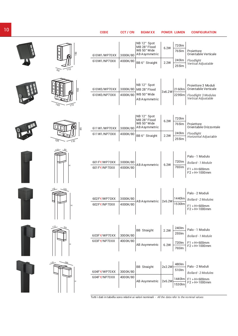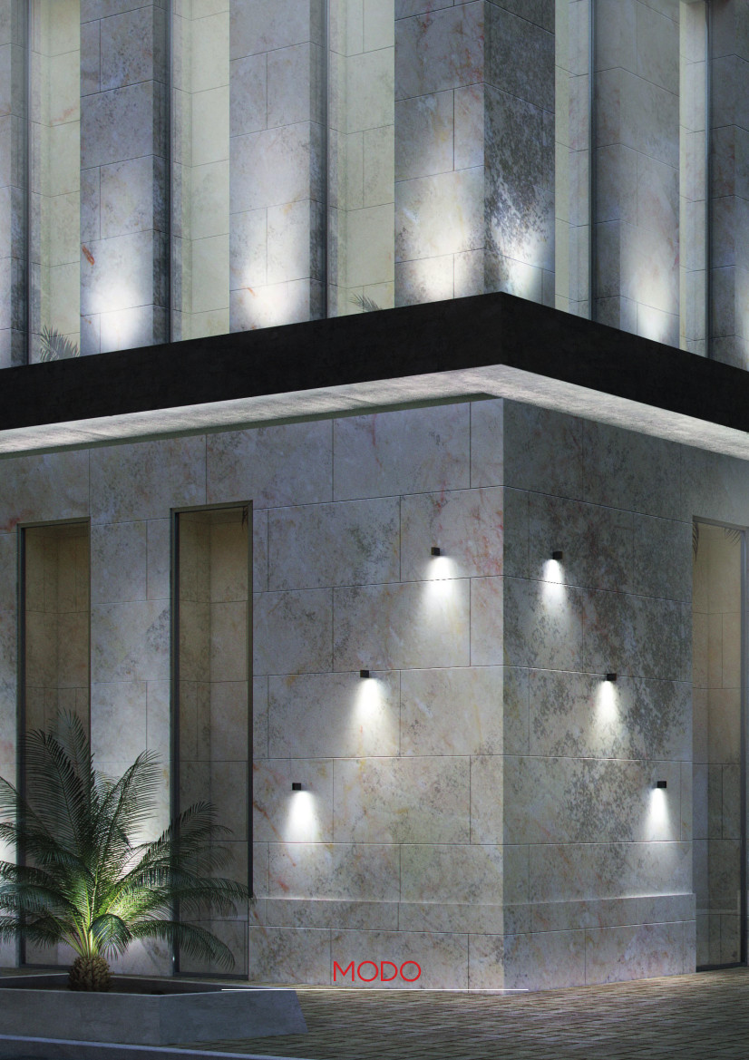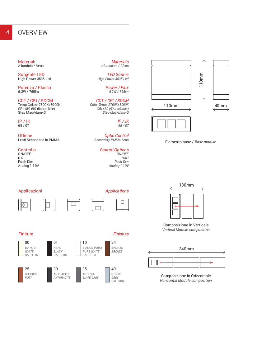 Un semplice parallelepipedo, dalla linea minimale e dalle dimensioni compatte, non più di 11cm. In grado di essere proiettore, in verticale o in orizzontale, oppure wallwasher a parete, o downlight a soffitto, o anche elemento a sospensione per interni, fino a diventare un sistema a paletto, orientato in funzione delle esigenze