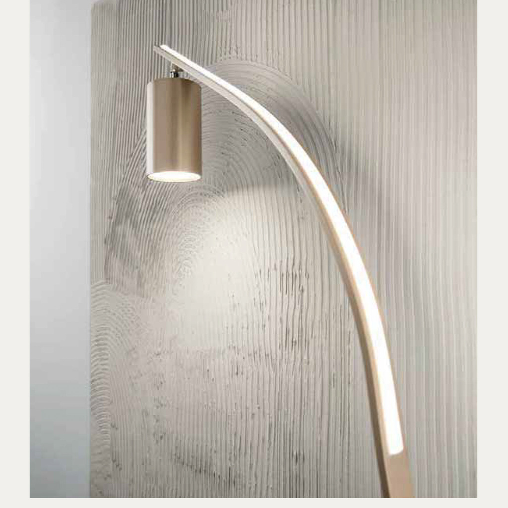 Piantana a LED in metallo verniciato con faretto orientabile e seconda emissione sul dorso. Dimmerabile, disponibile in diversi colori.