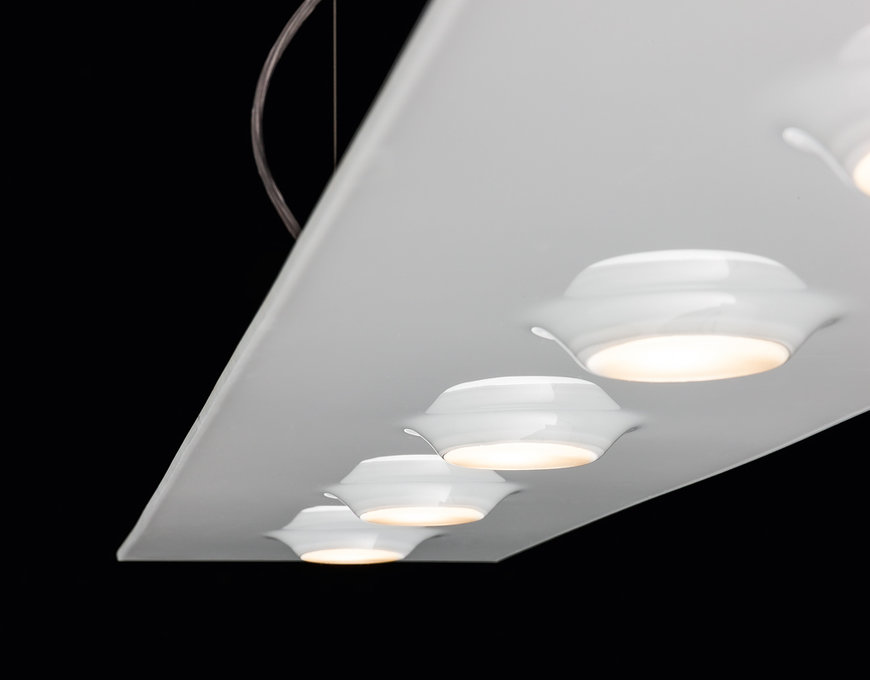 Pois è una suggestiva collezione di lampade in vetro piano con abbassamenti eseguiti a caldo.