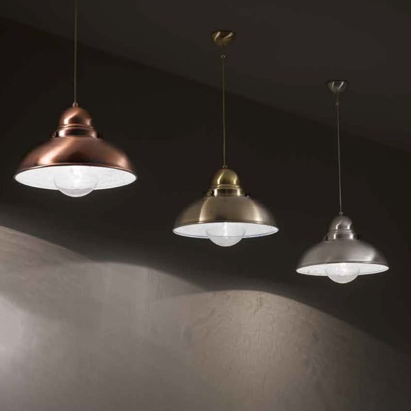 Corpo luce in metallo smaltato bianco all’interno e con finitura esterna disponibile in rame o in brunito.