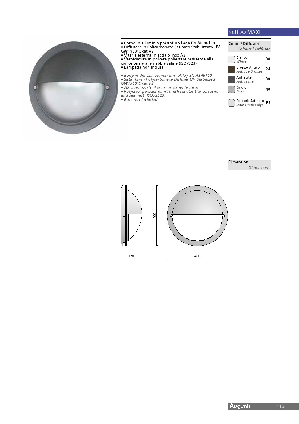 - Corpo: Alluminio Pressofuso e Diffusore in Policarbonato satinato