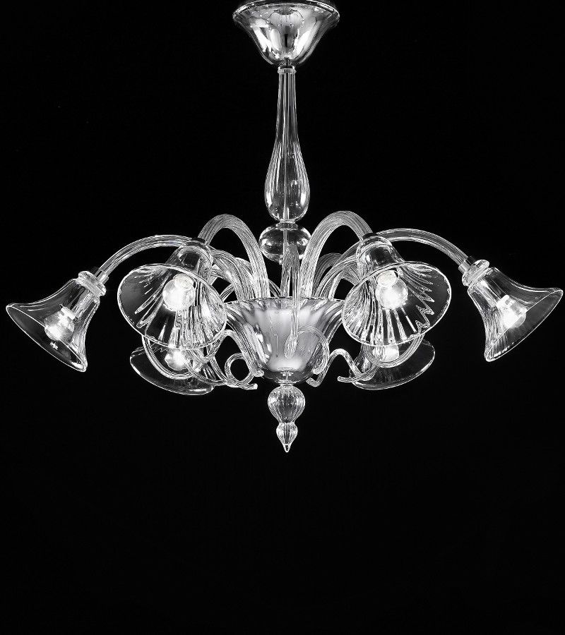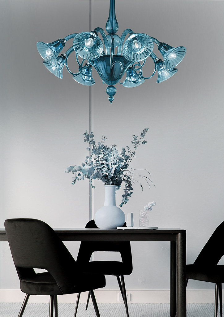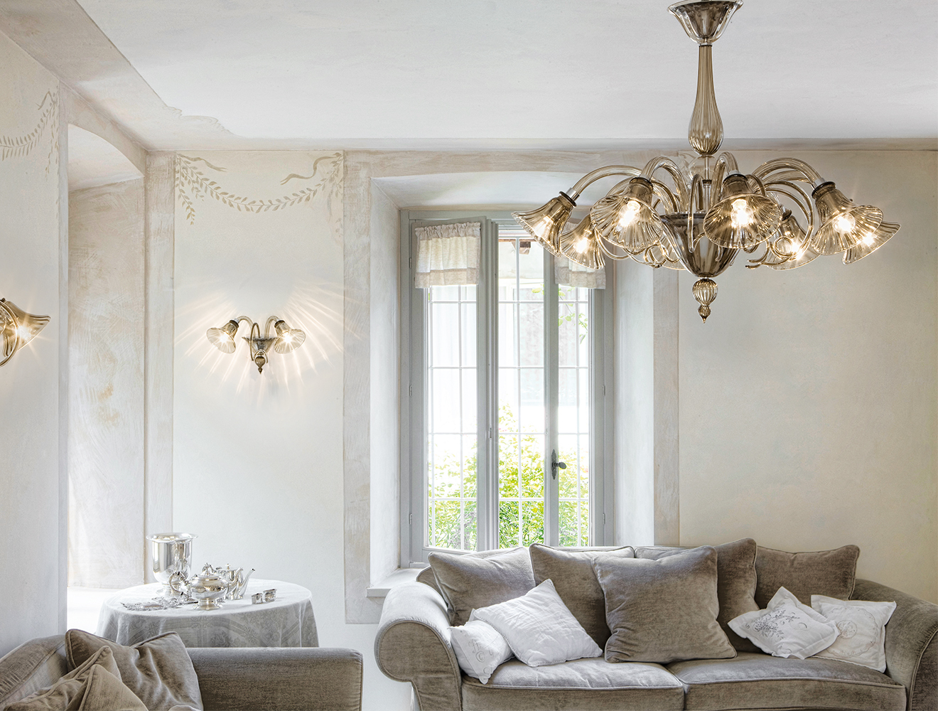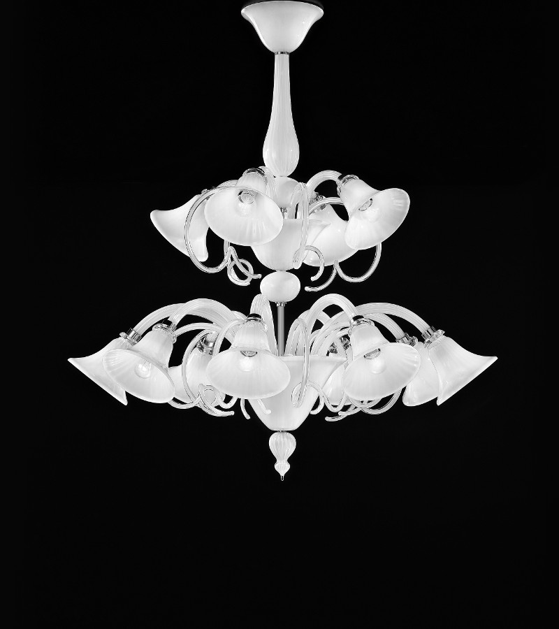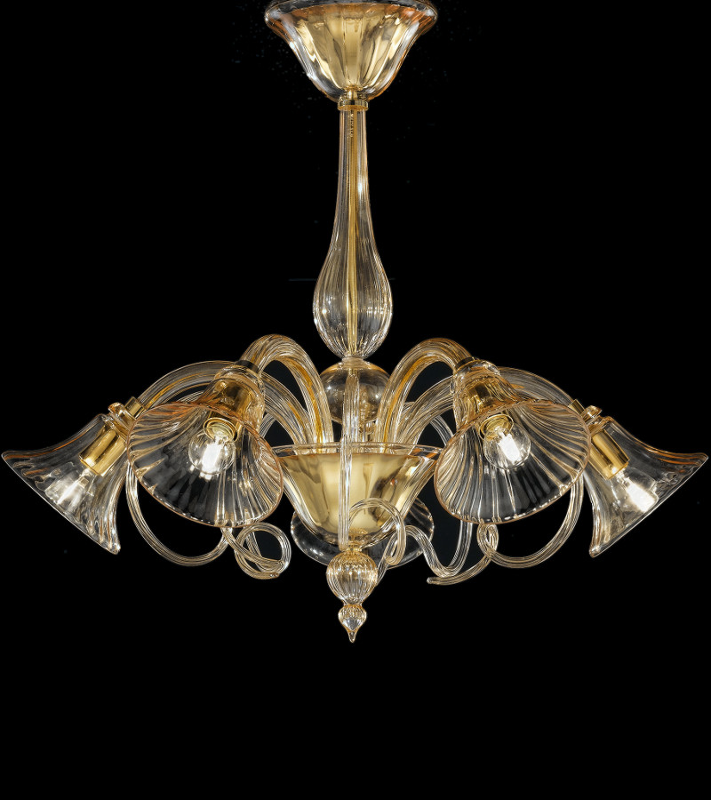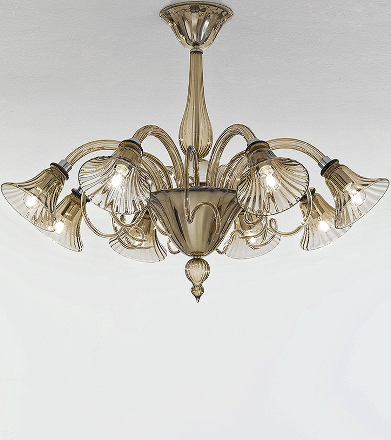 Collezione Teseo realizzata in vetro soffiato e caratterizzata da elementi decorativi a ricciolo e da campane sagomate.