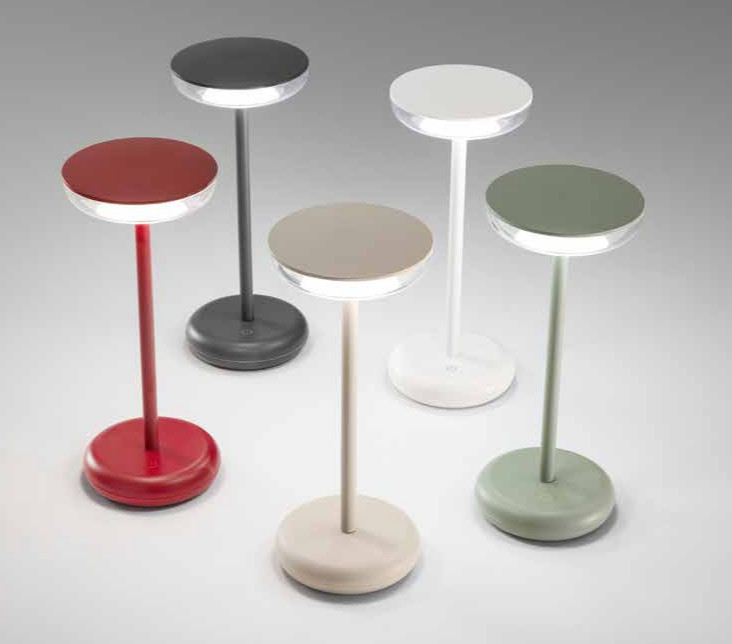 Lampada da tavolo ricaricabile a batterie in metallo e Abs verniciato per uso interno/esterno. Doppio diffusore in acrilico trasparente all’esterno e satinato all’interno. Interruttore touch sulla base che permette l’accensione e la regolazione dell’intensità luminosa.
