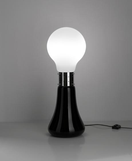 Rivisitazione contemporanea dello stile anni ’70 del vetro soffiato di Murano. La lampada ha due pulsanti di accensione distinti per la base ed il bulbo – che ha il variatore di intensità. Tali diffusori sono disponibili in vari colori o in cristallo trasparente. L’elemento di giuntura è in cromo o rame lucido.