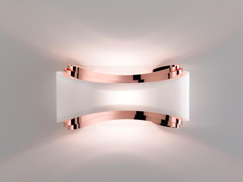 Applique formata da fascie d’acciaio sagomate al laser e successivamente piegata a mano per poter creare una forma fluida e composta. Il frontale è in vetro bianco satinato mentre le fasce retrostanti possono essere essere in cromo o rame lucido