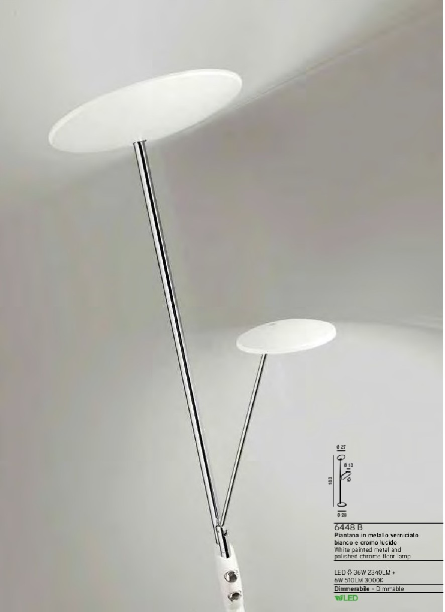 Piantana a in metallo Bianco e cromo lucido, con 2  sorgenti di luce a Led integrato, la parte superiore per una luce intensa e diffusa, e un braccio regolabile per una luce da lettura.